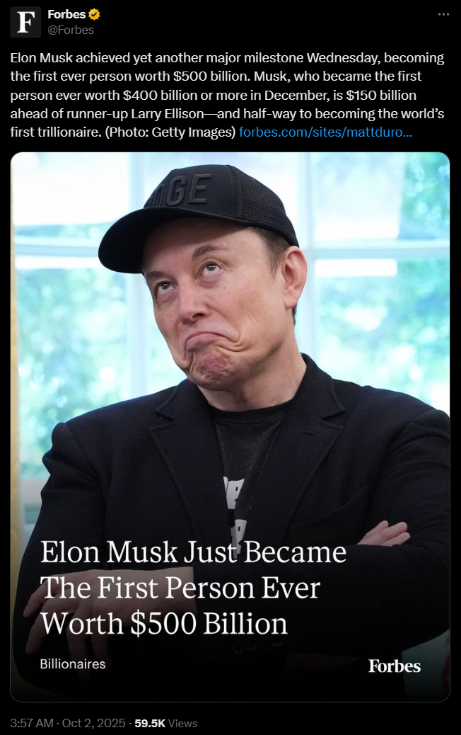 据《福布斯》报道,特斯拉CEO埃隆·马斯克成为有史以来首位个人财富达到5000亿美元的人。