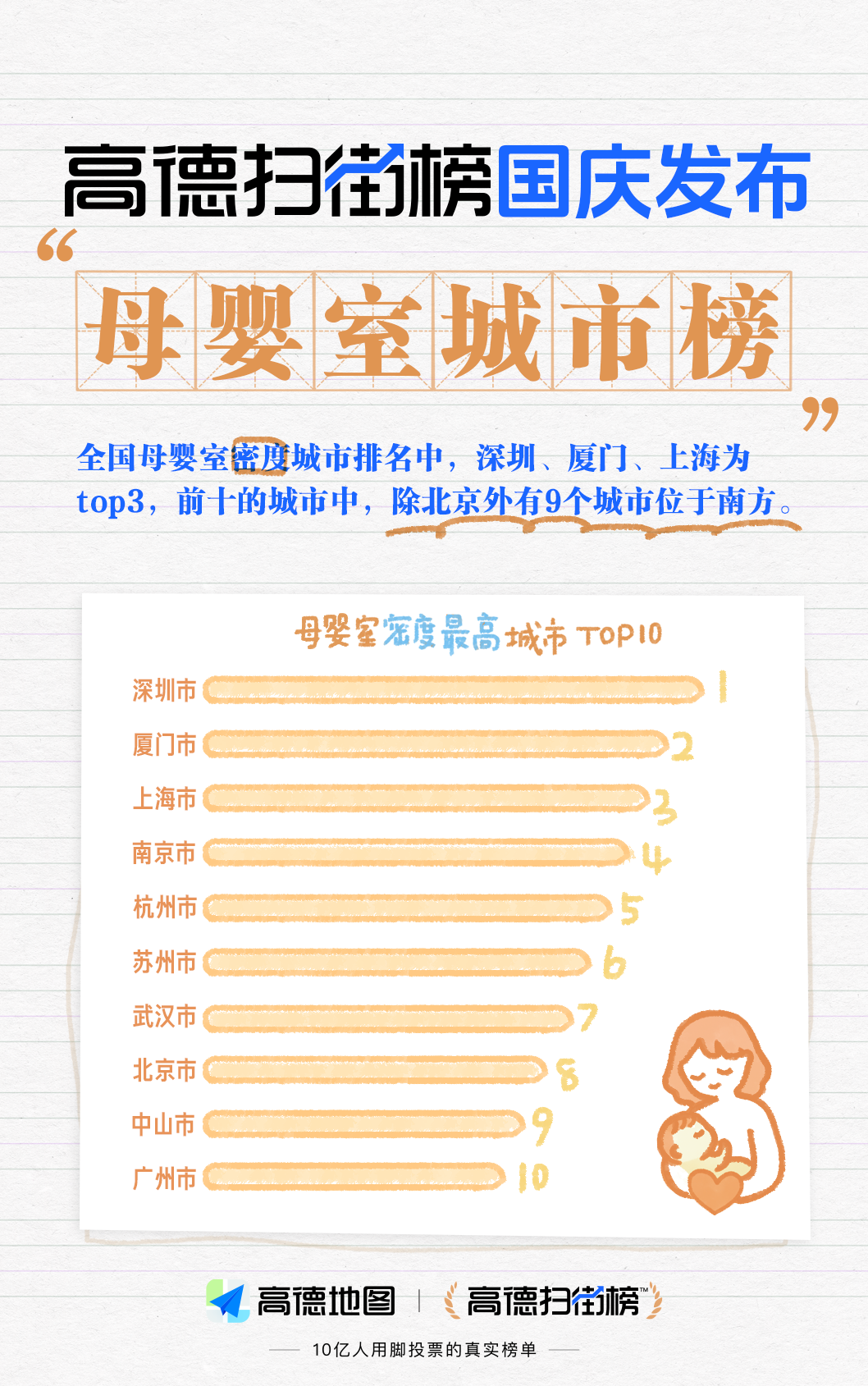 去年国庆黄金周,搜索母婴室次数最高的城市分别是杭州、北京、深圳、苏州、上海。
