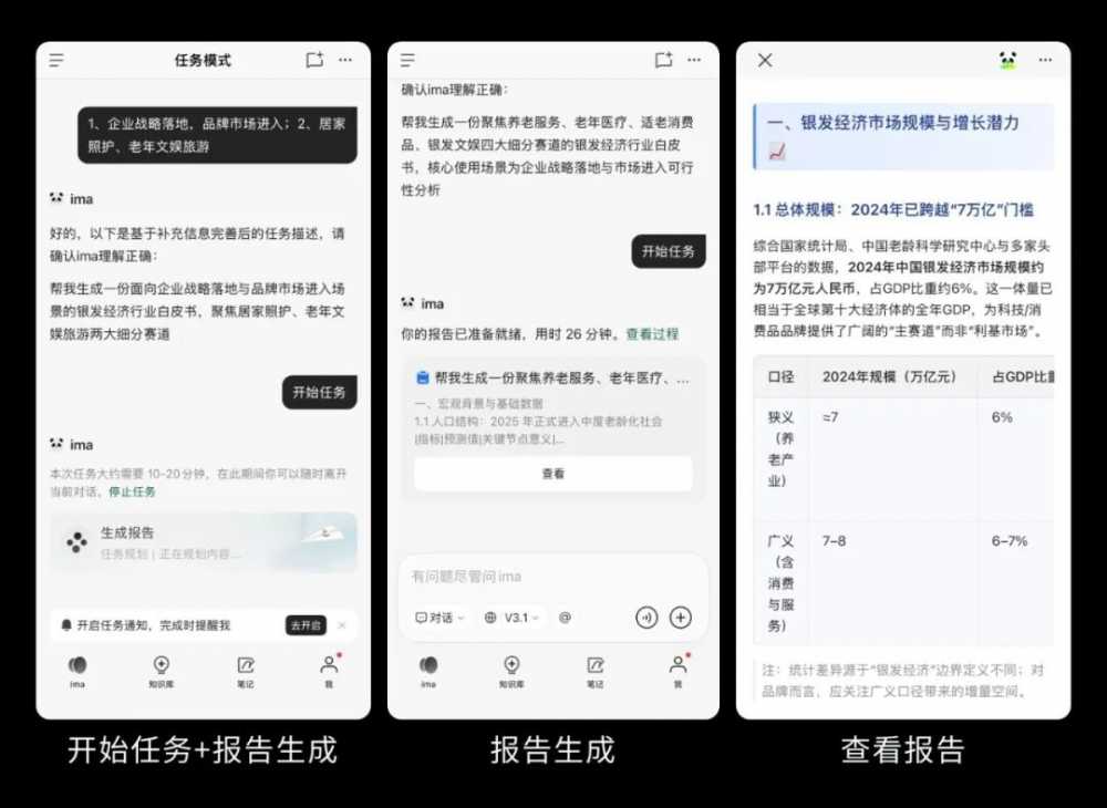 用户只需用自然语言发出指令,比如“帮我写一份三季度市场分析报告”“整理刚才的会议讨论并生成纪要”……ima会理解指令的真实意图,自动把任务拆解成多个步骤,调用包括精读、全网搜索、知识库查询、内容生成等工具,一步步完成任务,并在执行时自我监测和修正,最终输出一个可以直接使用的结果。