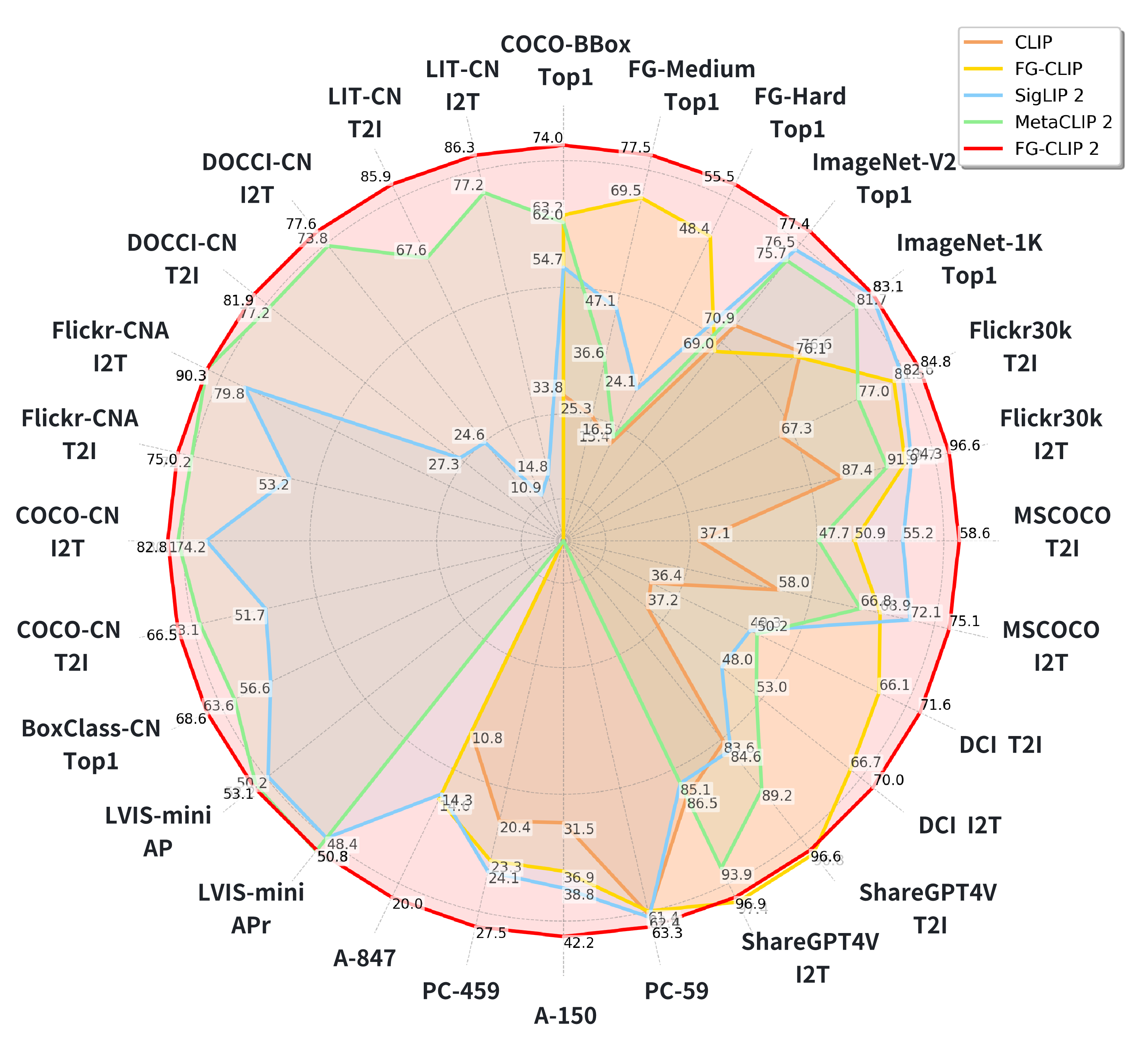 传统CLIP模型善于理解图像的全局概念,但在区分细微的物体属性、复杂的空间关系以及精准的语言表达时,往往力不从心。FG-CLIP2则实现了质的飞跃:它不仅能辨别出猫的具体品种,还能在遮挡情况下精准判断其状态;面对包含多个物体的复杂场景,其细节识别置信度仍高达96%。这种从“宏观”到“微观”的能力跃迁,是AI真正理解物理世界的关键一步。