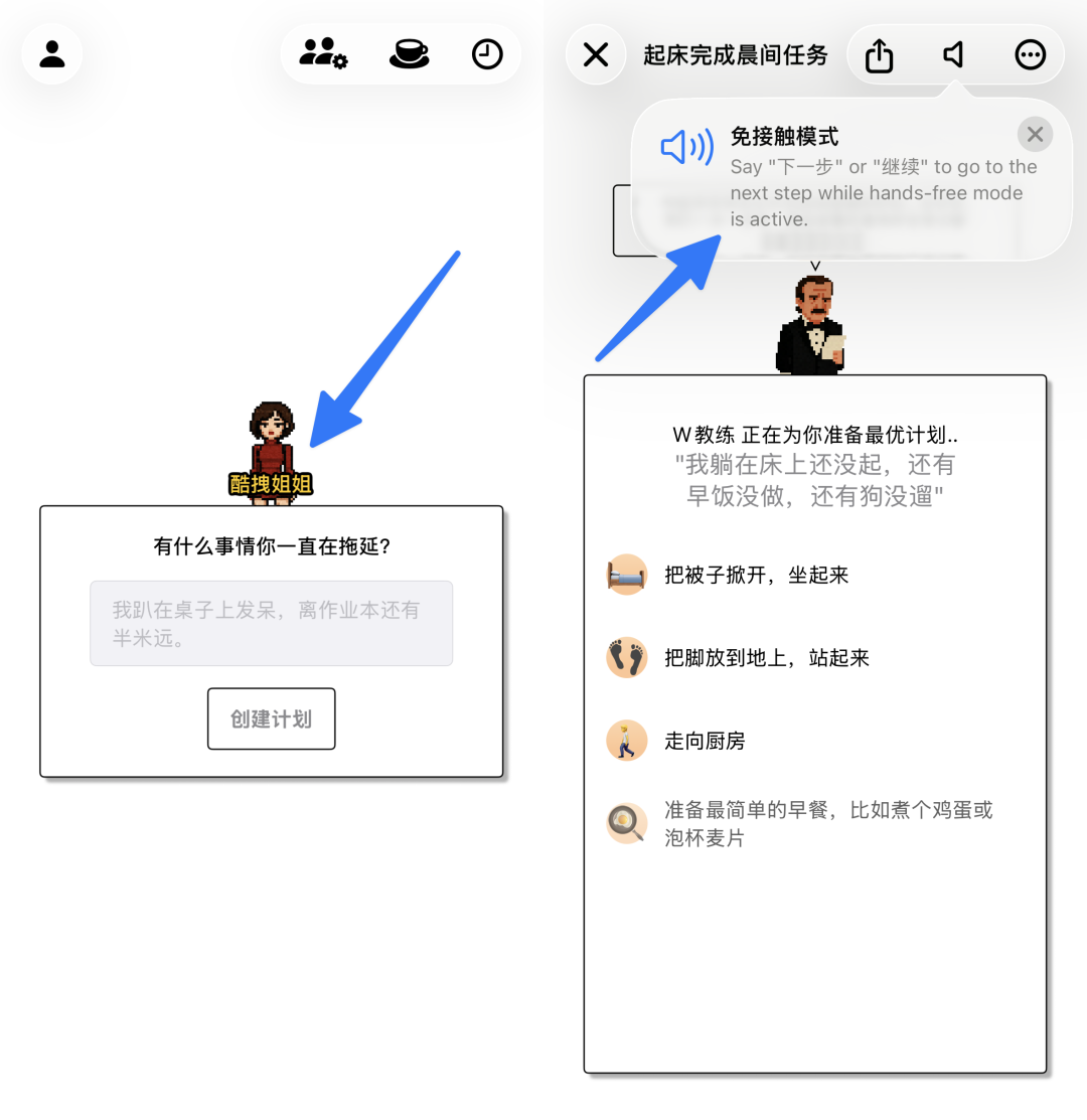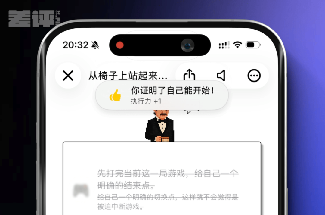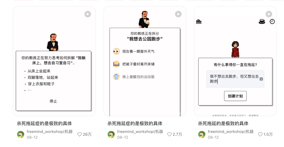 几秒钟后,这个教练会把任务切成很多个小块,每个小块下还有一行小字,写着各种心理引导的话术,什么“不用想太多,先站起来就行”这种。
