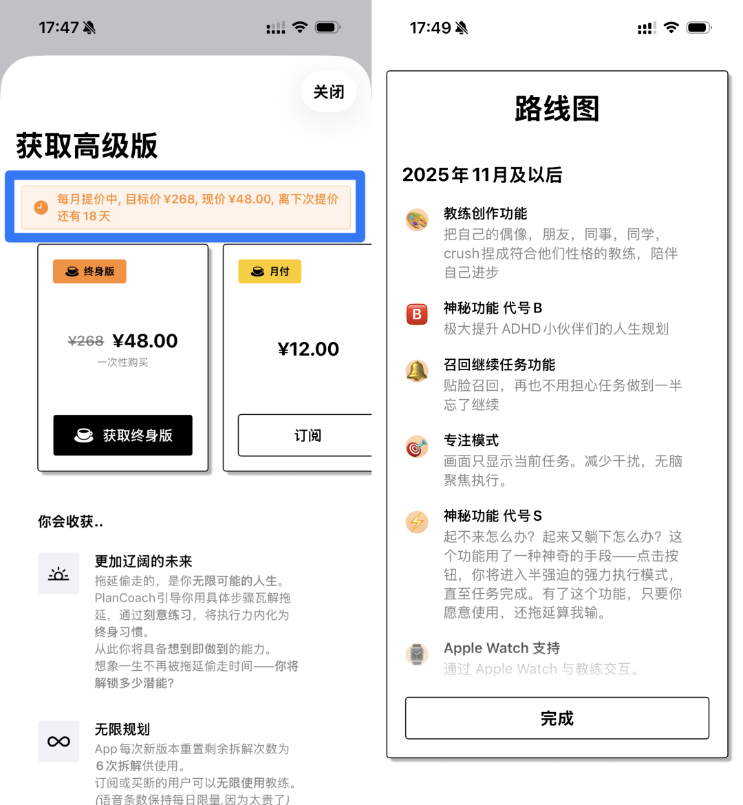 App 能免费拆解任务 6 次,每次更新版本后会重置。Pro 版本买断价是 48 块,月付 12 块,季付 22 块。