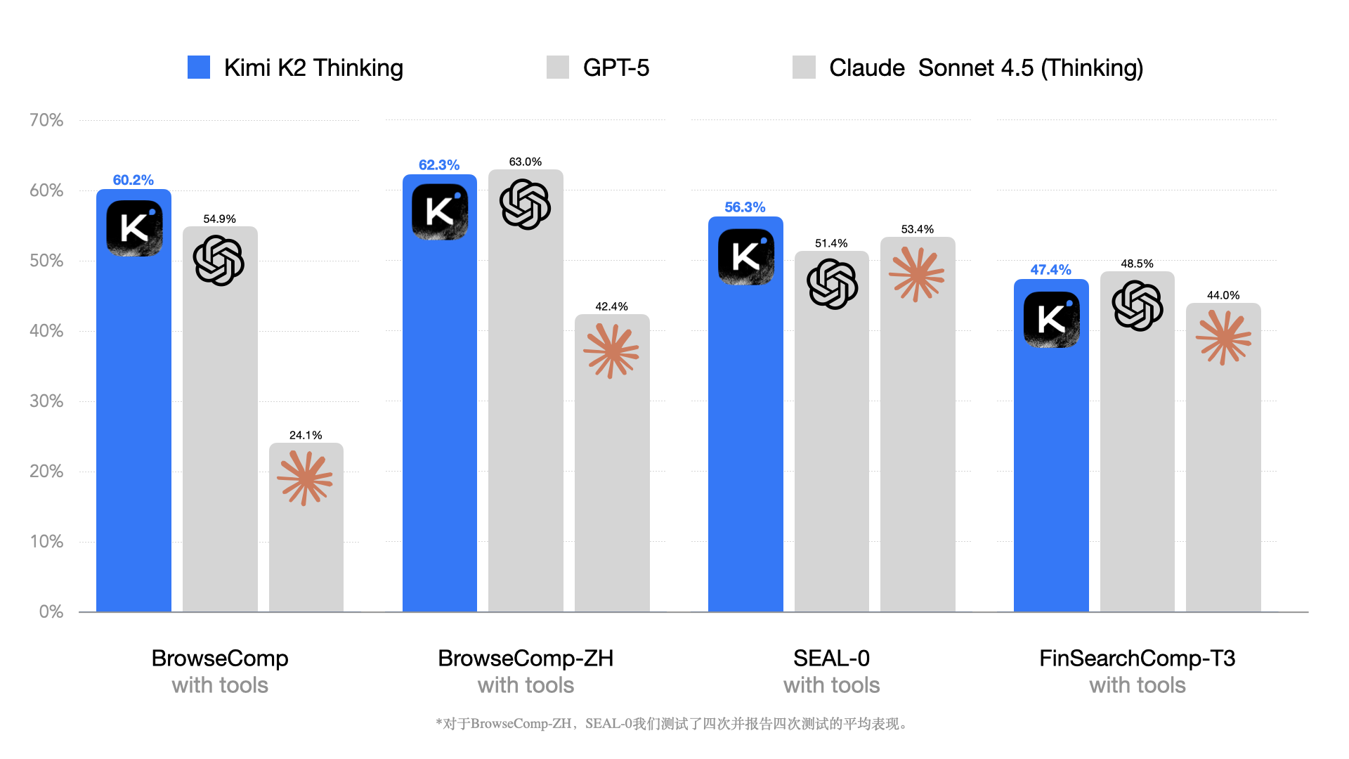 再来看BrowseComp,这是OpenAI推出的一个专门评估AI网络浏览能力的基准测试。Kimi K2 Thinking 在这项测试中拿下了 60.2% 的成绩,相比之下,人类的平均水平只有29.2%。这说明在信息检索和处理方面,Kimi K2 Thinking 已经超越了很多人类专家。