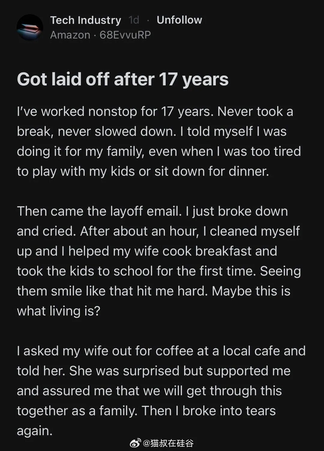 “自己连续工作了17年。从未休息,从未放慢脚步。我告诉自己,我是为了家人。然后裁员邮件来了。我彻底崩溃,哭了。一个小时后,我收拾好自己,帮妻子做早餐,第一次送孩子们上学。看到他们笑得那么开心,真的很震撼我。也许,这才是生活?”