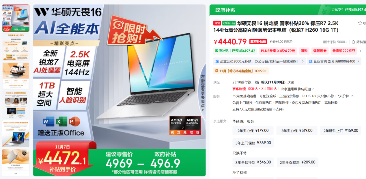 年末大促,又到了各位升级装备的时候。对于囊中羞涩的学生党和职场新人来说,一台能打的轻薄本尤为重要。华硕无畏16 2025,作为4K价位段的选手,凭借AMD锐龙7标压处理器、2.5K 144Hz高刷屏,以及最高40GB的内存扩展,进入了我们的视野。双十一期间,部分地区叠加政府补贴后,到手价仅需4472.1元(具体活动细则建议咨询客服)。