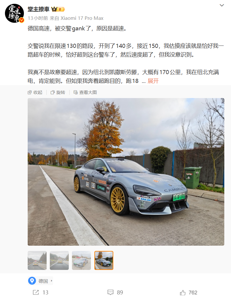 尽管如此,博主也表示会吸取教训,强调超速行为不可取,并感谢了德国警察的友善。