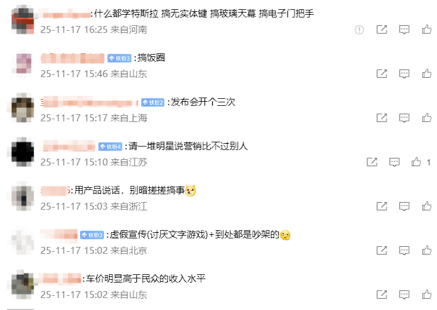 除了“饭圈化”操作,其他被吐槽的焦点还包括:经销商模式下价格混乱,大家争相模仿特斯拉,发布会恨不得开三次才能讲完,以及一些品牌方热衷于虚假宣传。