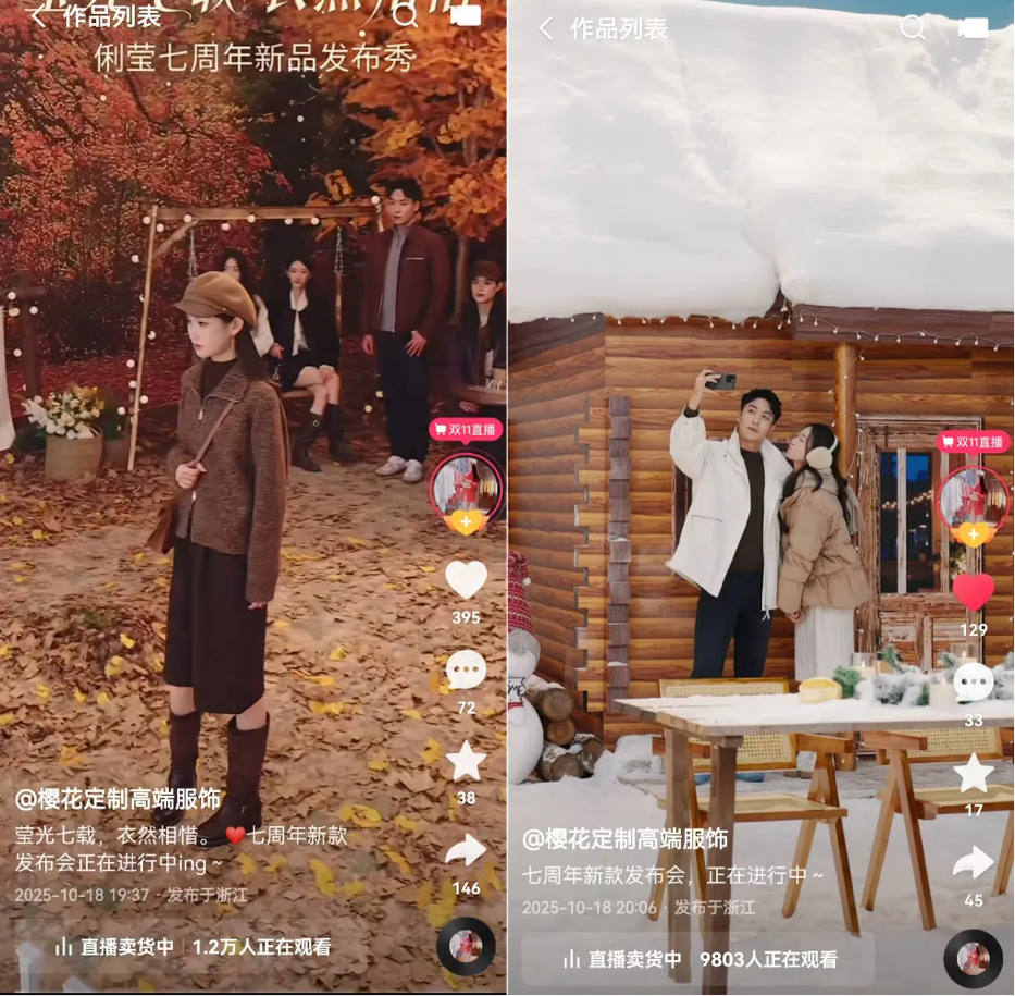 于是,团队在直播间还原了“秋日公园”和“冰雪秘境”两个最具代入感的布景,让用户在观看时不仅能欣赏服装,更能瞬间联想到自己的穿着场景,激发购买欲望。