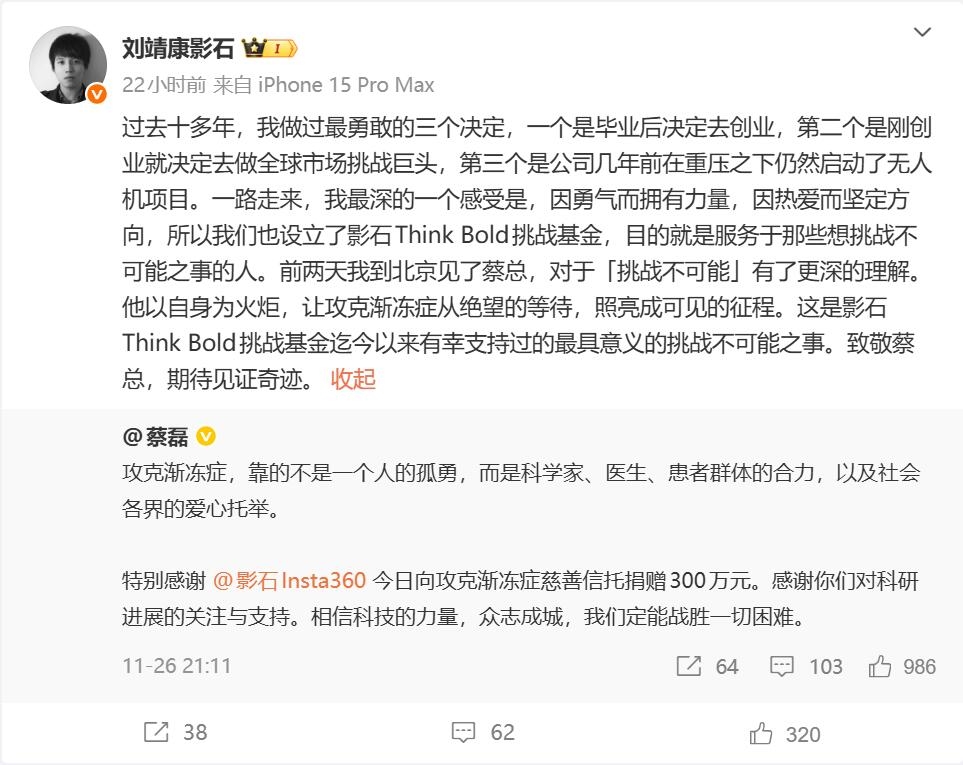 AiSiri网11月29日消息,蔡磊在个人微博宣布,影石向攻克渐冻症慈善信托捐赠300万元。感谢你们对科研进展的关注与支持。相信科技的力量,众志成城,我们定能战胜一切困难。