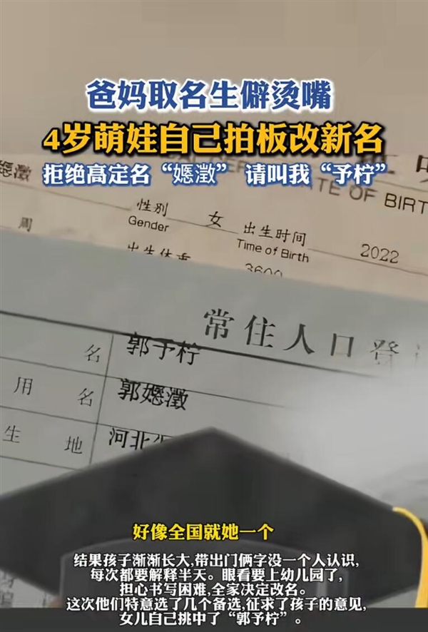 为了避免女儿在未来求学、生活中持续面对这种尴尬与不便,在女儿即将步入校园之际,这对父母做出了一个决定:让4岁的女儿自己选一个新名字。